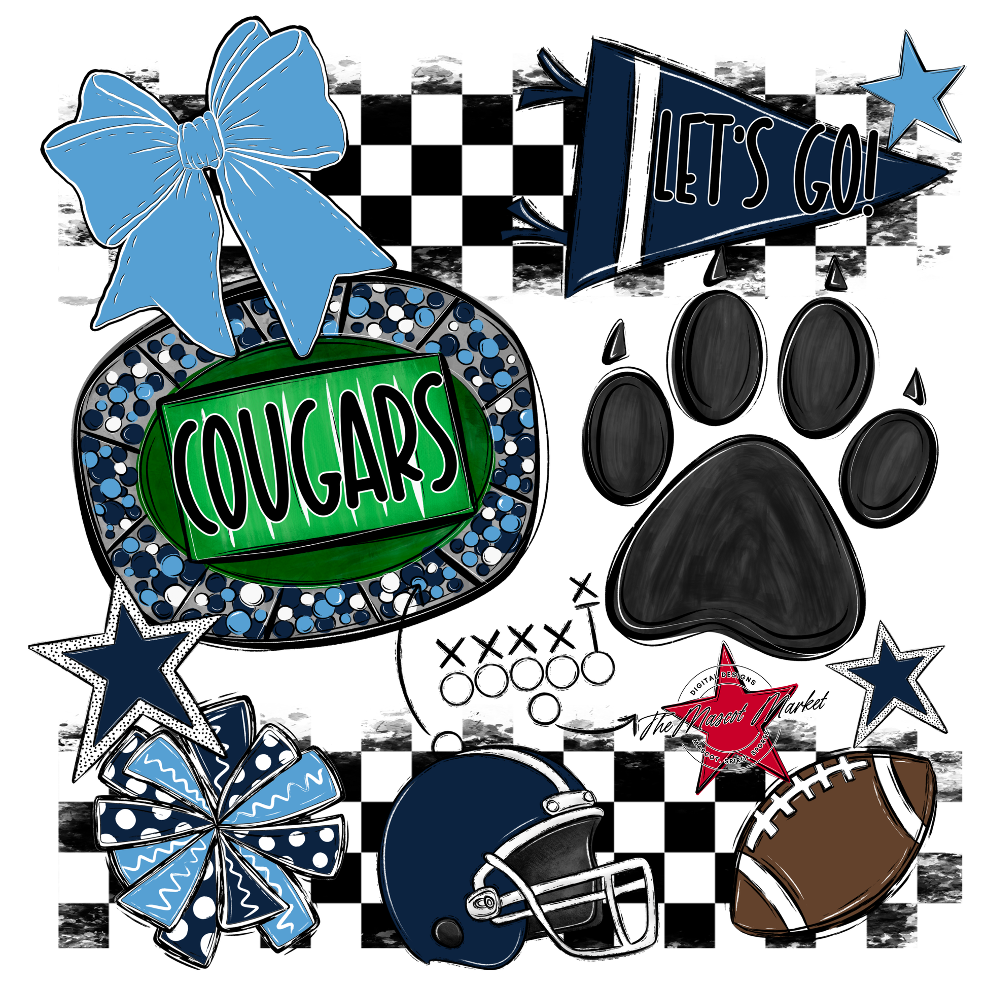 Cougars Checkers Mascot Spirit Design w Paw-Navy-Carolina Blue