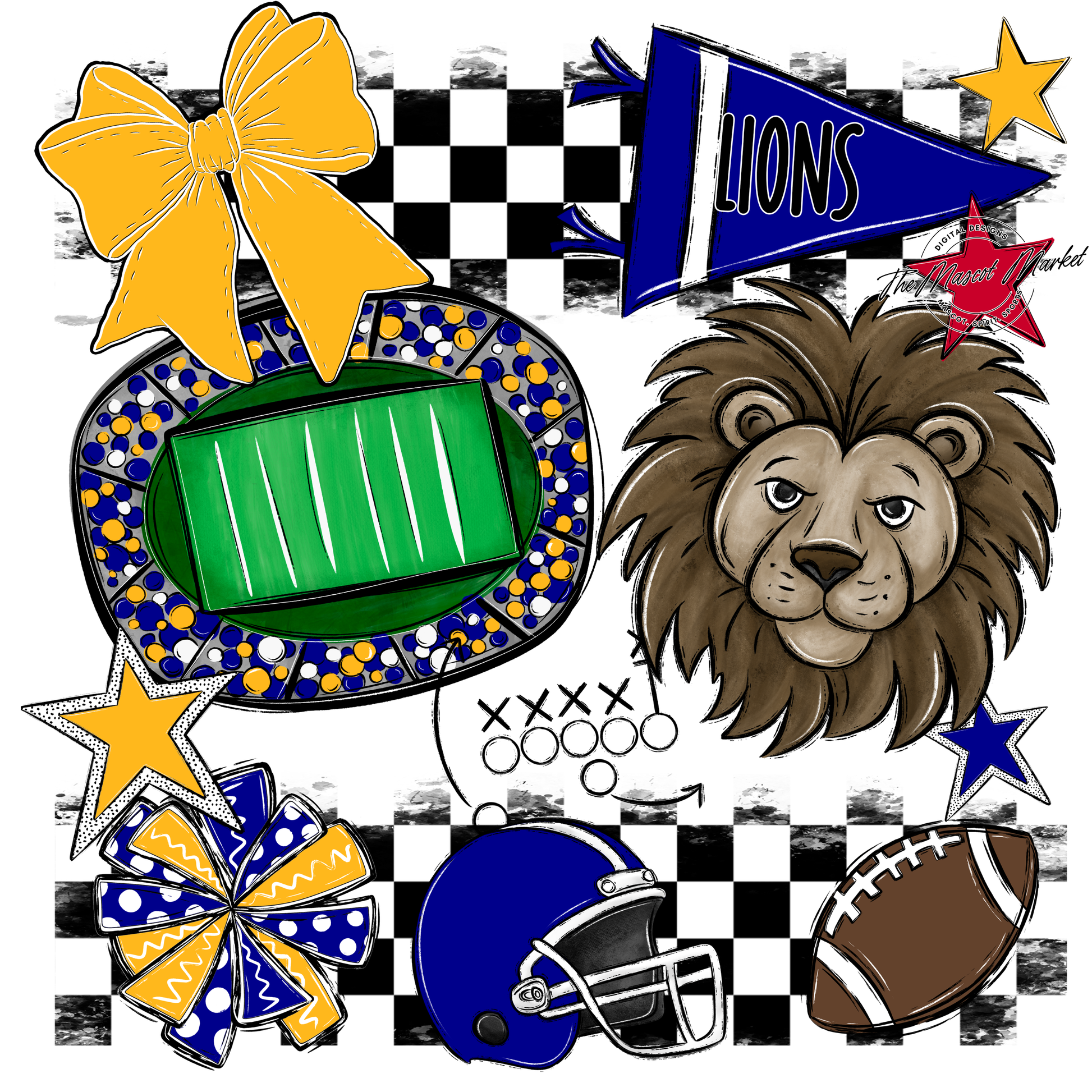 Lions Checkers Mascot Spirit Design-Blue-Yellow